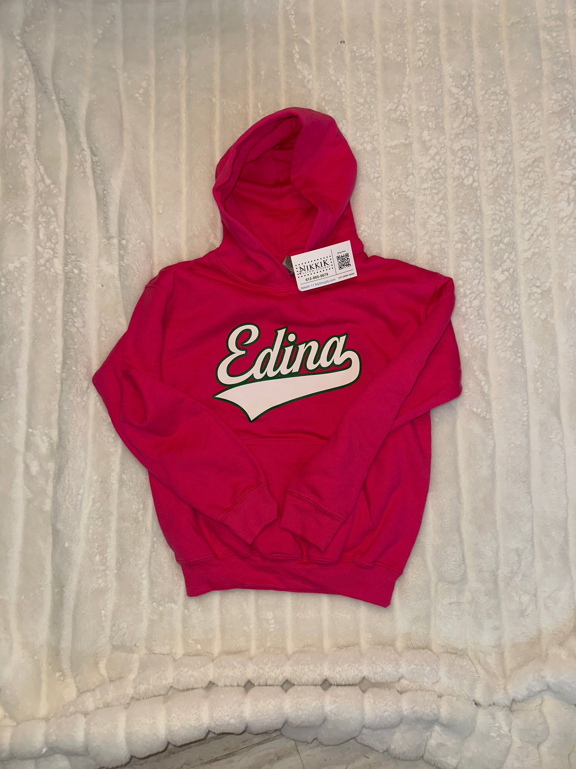 Perfect medium weight hoody. Great raspberry pink with green & white screenprinted Edina.